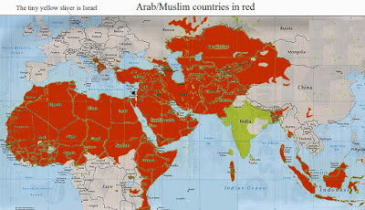 Veja neste mapa Israel a amarelo (amplie para ver) e o mundo islâmico, a encarnado: