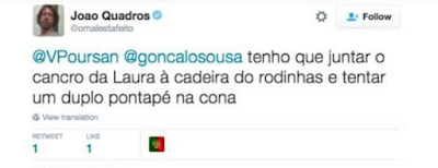 (Aos nossos muitos amigos brasileiros que não sabem quem é este João Quadros: é uma espécie de Gregório Duvivier luso, um menino rico que não cresceu, maconheiro, esquerda-caviar, famoso por ser famoso e por escrever graçolas sem graça, que cultiva os mesmos tiques de superioridade e o mesmo desprezo pelo povo).