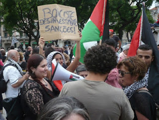 Manifestação do BDS em Lisboa, em apoio ao grupo terrorista, islamista e nazi Hamas, a propósito da Operação Protecção-Limite. Estiveram os comunistas Chico Louçã do Bloco de Esquerda, e Arnaldo "Viva o ISIS" Matos e Garcia Pereira do MR Pum Pum.in Que mal fizeram os judeus à Humanidade?