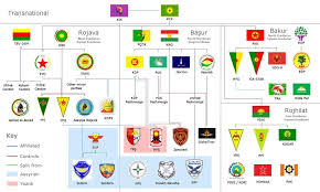 Uma floresta de siglas e bandeiras designa os grupos armados curdos.